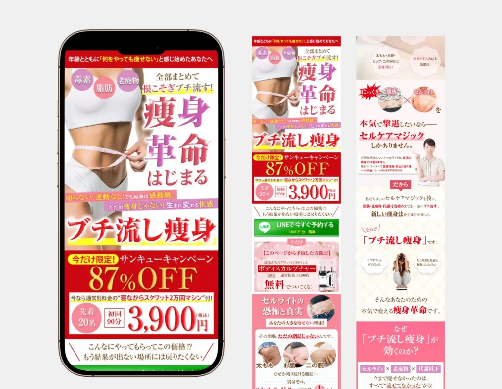 デザイン:幅広い年代の方がターゲットということで、なるべく年齢層が偏らないような配色を心がけました。フォントは、エステでよく使用される明朝体を使用し、女性に好まれるように工夫しています。また、割引率を大々的にアピールしたいとのことでしたので、そちらを目立つようにしてみました。