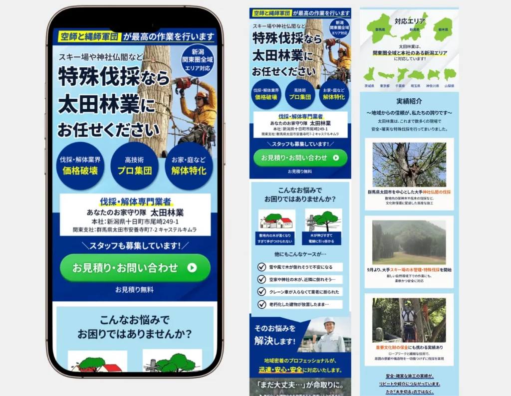 デザイン:このサイトは「どこに頼めばいいかわからない」というお客様の不安を解消するため、「プロが安全に作業を行う」という安心感をデザインの核に据えました。信頼性の高い青色を基調とすることで、誠実かつ専門的な印象を与え、お客様に安心してご依頼いただけるよう工夫しています。